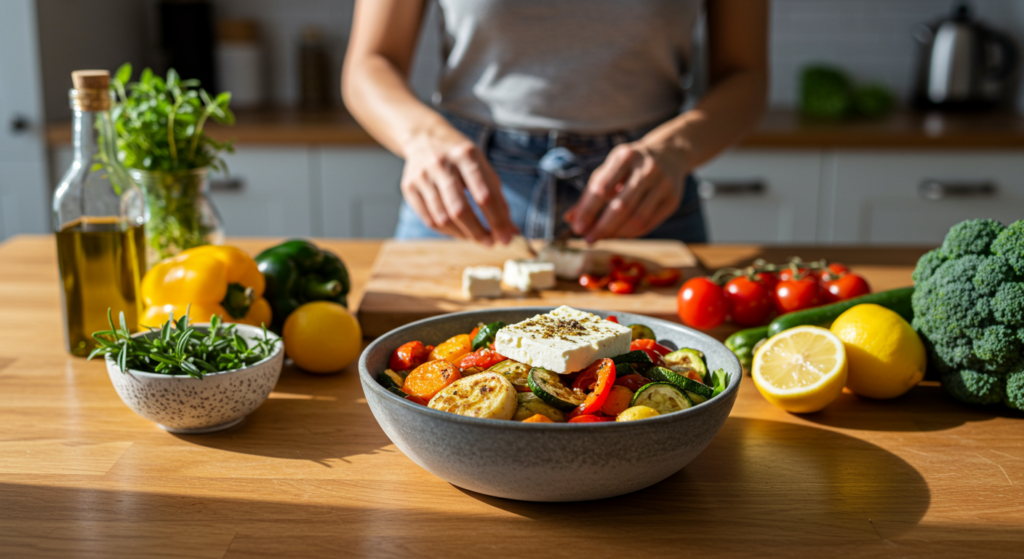 まずは1品プラス: いつもの食事に、野菜やきのこ、海藻、魚などを1品増やしてみる。