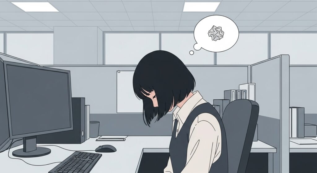 上司の田中さんの声が、いつものように事務所に響いた。ちひろは小さく頭を下げて、赤ペンで修正された書類を受け取る。胸の奥が重くなって、呼吸が浅くなるのを感じた。